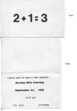 The birth announcement was made by Luanne and Ira and reflects his mathematical profession.