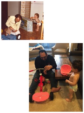 Around 1983 Ira assembled Jeremy’s first riding toy (blue car). This year Joe assembled Elijah’s first riding toy (pink bike).