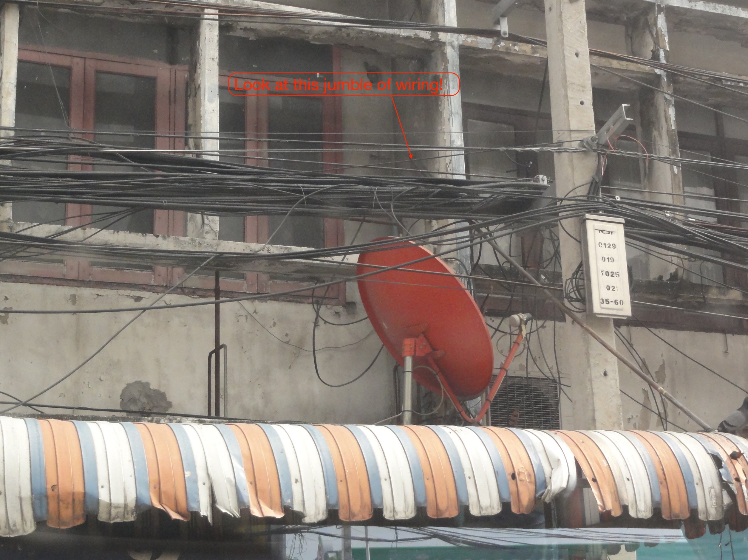 Bangkok is a city of conflicting images. There are modern buildings, many of which are designed to mimic other famous skyscrapers (e.g., Empire State Building in NY, Pickle in London), highways clogged with horrible traffic (8 million vehicles for 12 million people); yet many parts of the city are primitive and the stringing of electrical wires into the apartments is so bizarre it is hysterical.