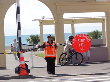 Three languages, a huge sign (it swings out of the way when you can go) and a crossing guard just in case you are not paying attention.