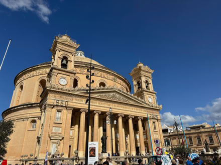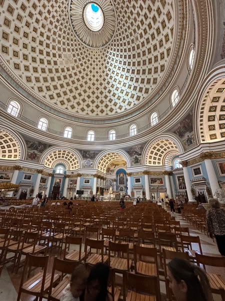 Which brought us to the town of Mosta, home of the church with the third largest rotunda in Europe. It is impressive. It is made even more impressive by the fact that during World War II a 500 kg German bomb dropped through the roof of the church. It bounced off a wall with an image of Jesus and fell to the floor, and it never exploded. No one was injured. The town attributed it to the image of Jesus giving salvation. The church was later blessed by the reigning Pope.