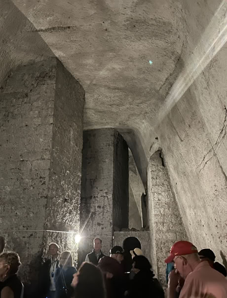 We also did an interesting tour of the underground WW II bomb shelters that were built in 1940 by Mussolini's army. This is more fascinating than it sounds since the shelter is really an expansion of the 2000-year old aqueduct and cistern system. Originally thought to hold a few people for a short period of time, the shelter ended up being the home for tens of thousands of people for 180 days in the first nine months of 1943. Not expecting this many people for so long, it is estimated 25,000 overall died in the shelters. Some were even born there.