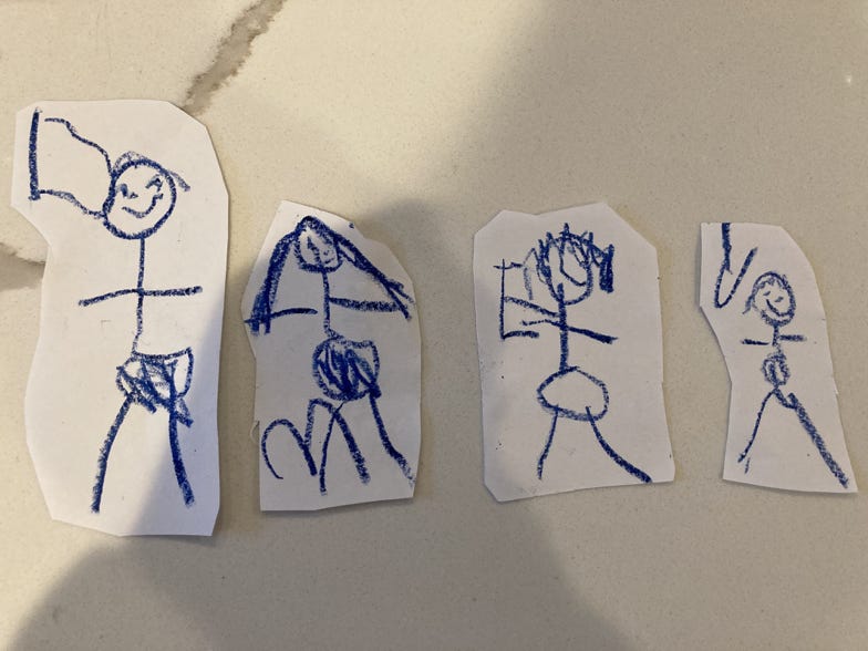 Elijah’s (age 4-1/2 version) of the immediate family. Note the letters that label each person in the family: Dad, Mom, Elijah and Violet.