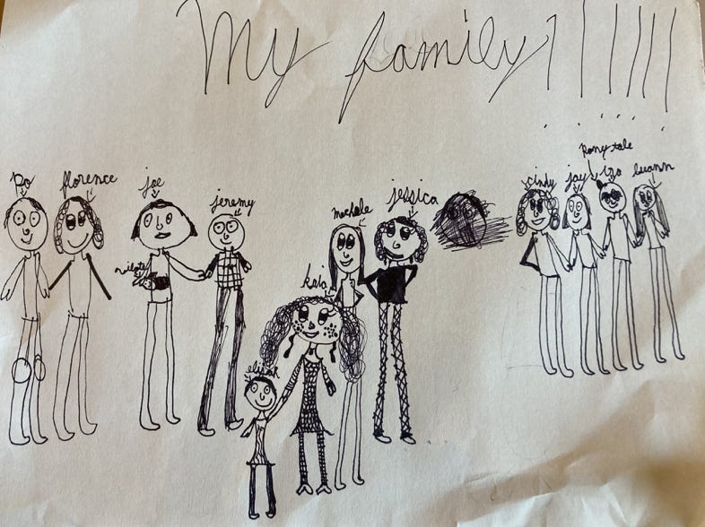Just a reminder of whom we all are—an abbreviated family tree drawn by Kaia (age 7-1/2).