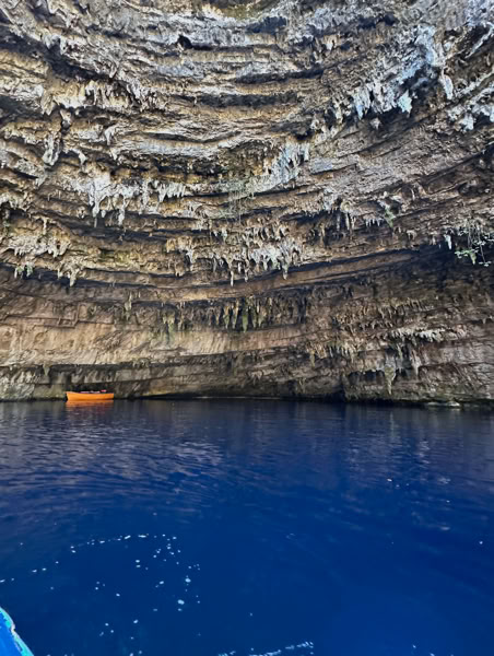 The panoramas are breathtaking, the towns quaint with tourist shops and the water ever changing colors of blue. We did visit the underground Lake Melisani and the associated Drogarati cave. Interesting, pretty, glad to have seen them. We covered a lot of the island, saw the sights .