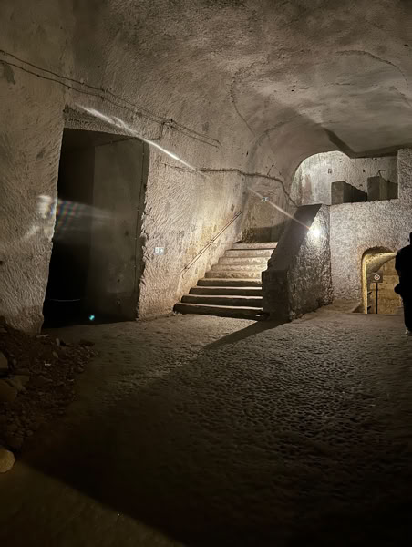 We also did an interesting tour of the underground WW II bomb shelters that were built in 1940 by Mussolini's army. This is more fascinating than it sounds since the shelter is really an expansion of the 2000-year old aqueduct and cistern system. Originally thought to hold a few people for a short period of time, the shelter ended up being the home for tens of thousands of people for 180 days in the first nine months of 1943. Not expecting this many people for so long, it is estimated 25,000 overall died in the shelters. Some were even born there.