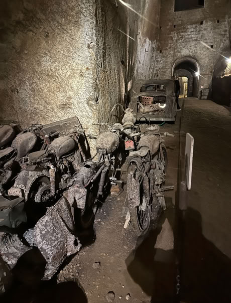 After the war this part of the underground was used by both the Mafia and the police to dump miscellaneous items. The police put impounded cars and motorcycles down there and many of these rusted relics are still seen there. An interesting footnote to this is that our underground guide spoke nearly accent free English. When asked where she learned it, she said "TV".